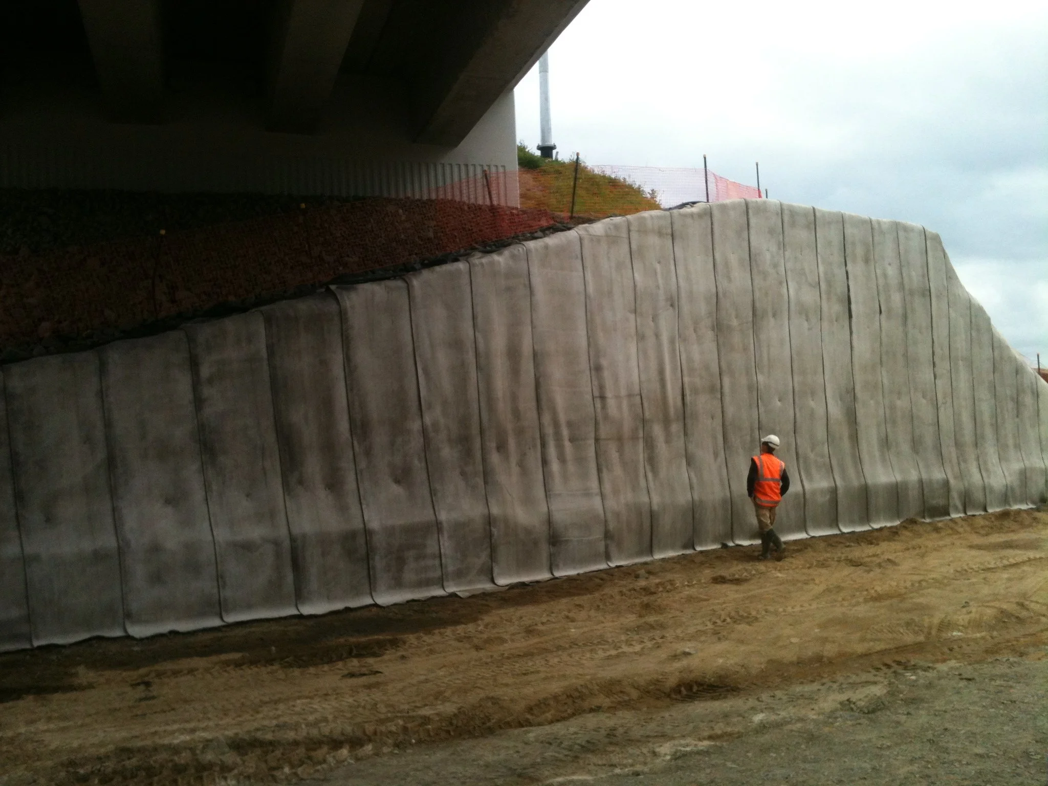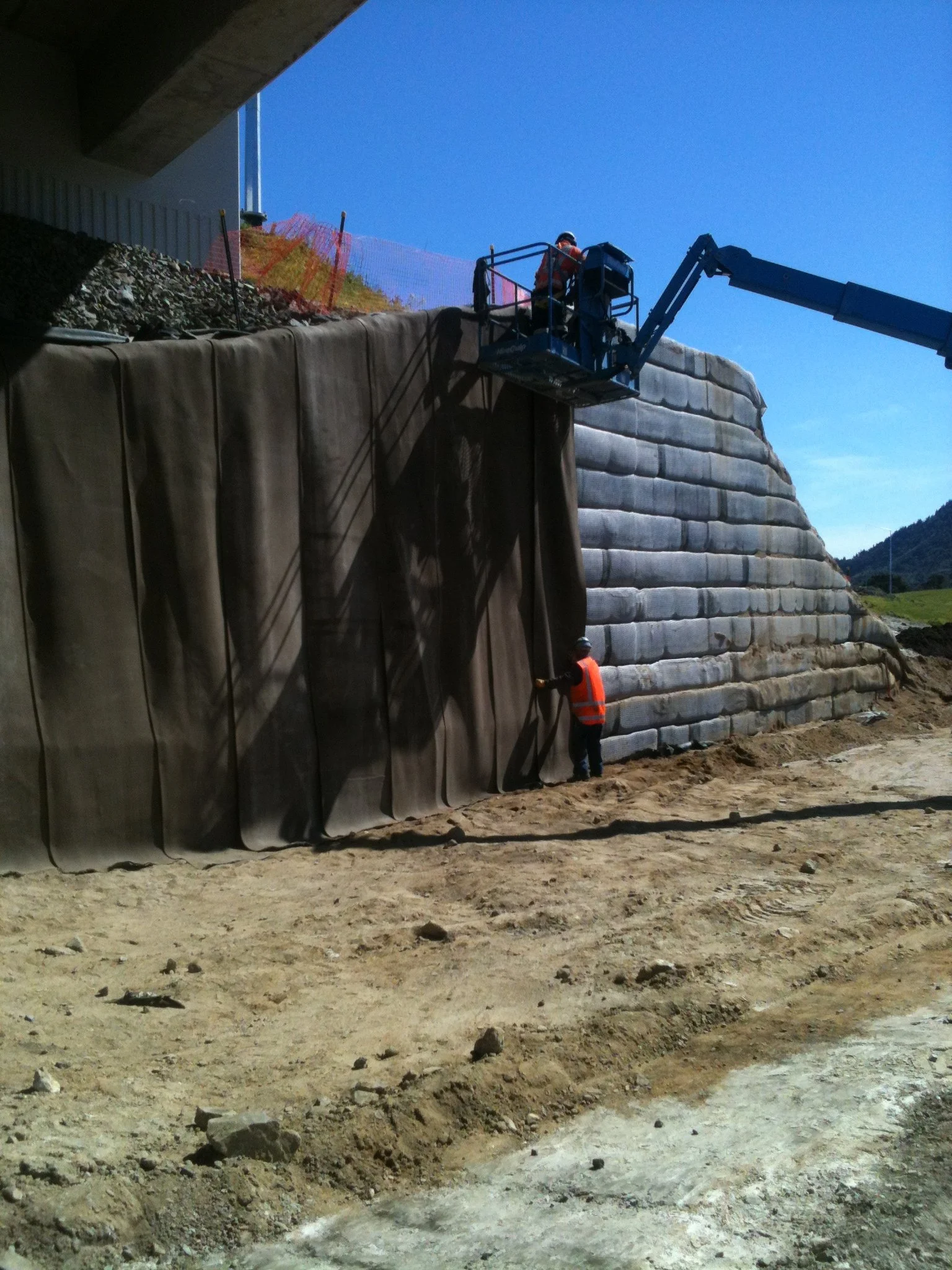 In September 2013, Concrete Canvas (CC) was used as an erosion control solution on a section of bridge abutment in Taupiri, New Zealand. The CC was being installed as a capping layer to an existing geogrid system. Shotcrete was initially considered for the project, but would require specialist equipment and labour, as well as extending the installation time.