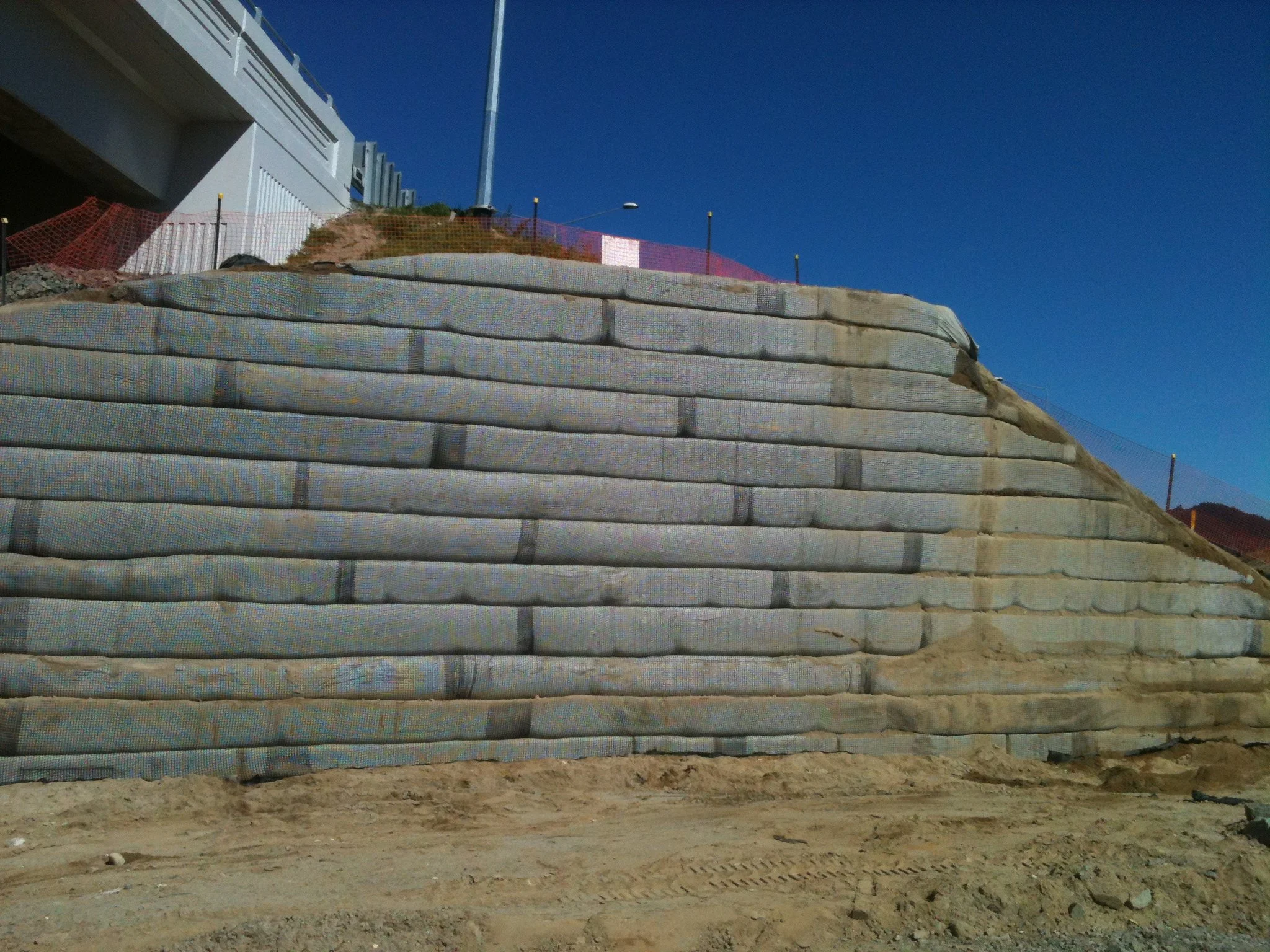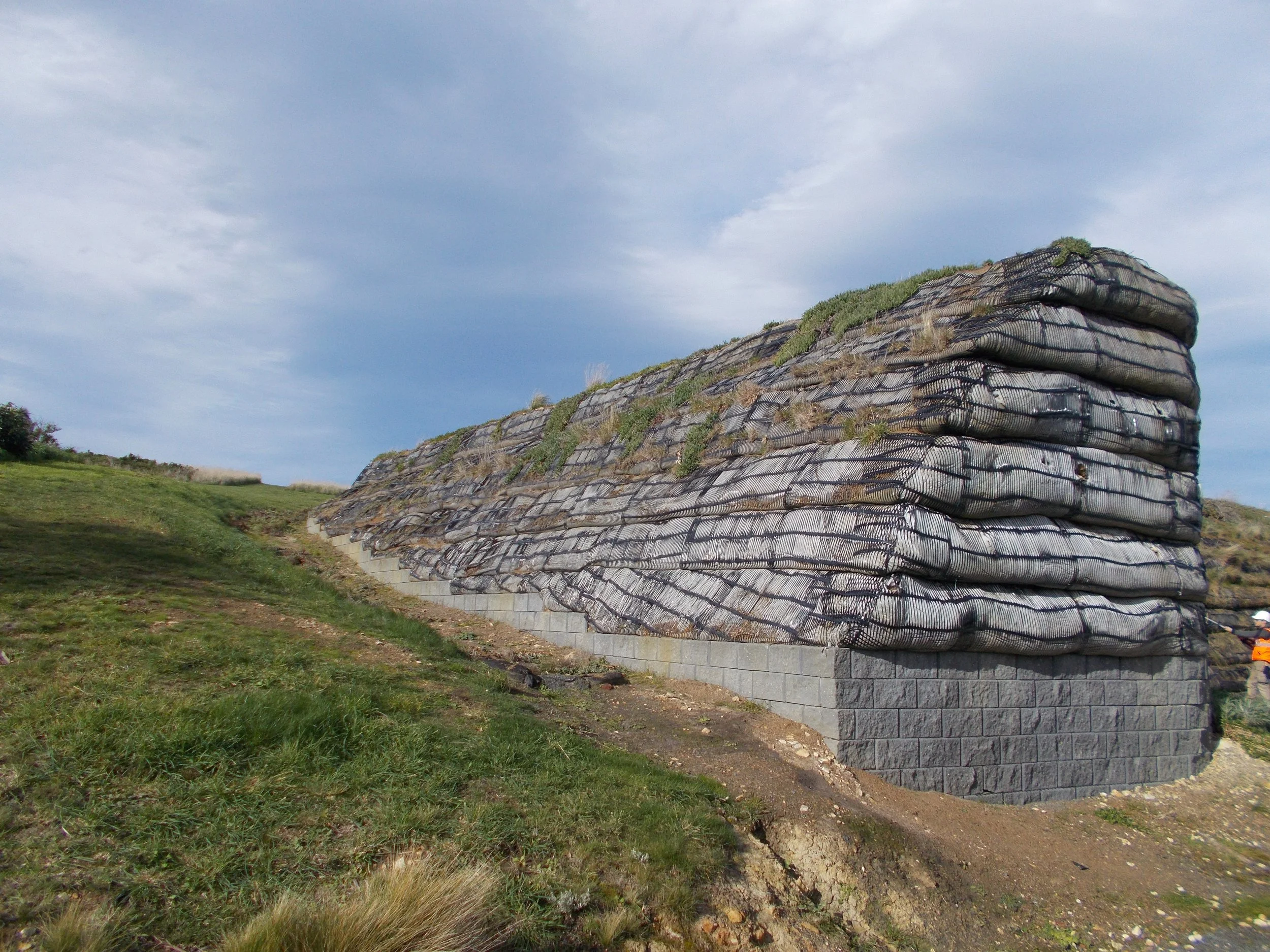 In 2015, Concrete Canvas® GCCM* (CCTM) was used in Australia to protect a temporary soil bund and transform it into a permanent structure, by providing UV protection and preventing animals from nesting. The temporary geosynthetic reinforced soil bund wall was constructed using reinforcing geogrids to create a wrap around structure, with the geotextile liner installed to provide the facing and contain the soil temporarily for the short life of the structure. However, the clients requirements changed, with the structure needing to be in place permanently. The clients had hoped that vegetation growth would establish over time, but after 8-years in service this could not be maintained all season and the facing geotextiles were exposed to UV degredation. Birds were also damaging the facing geotextiles by burrowing in the structure. Shotcrete was used as a temporary filler but was never considered viable as a permanent facing due to cracking from settlements and temperature and moisture changes
